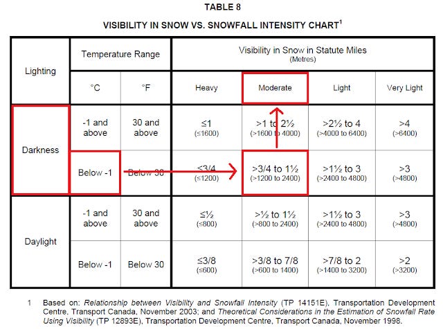 Using the visibility chart, this would be categorized as moderate snow, even though the METAR states “light snow.” This more conservative assessment is used when applying HOT tables.