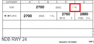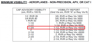 When approaching an aerodrome, after selecting the desired approach, consult the advisory visibility on the CAP. This value is published in statute miles and RVR or only in statute miles. For example, if the pilots select the NDB 24 approach and the advisory visibility is 1-3/4, the CAP GEN states that for a “Minimum Visibility – Aeroplanes – Non-Precision, APV, or CAT I” approach, the visibility must be at least 1-1/2 statute miles or ≥6000 RVR to commence the approach.