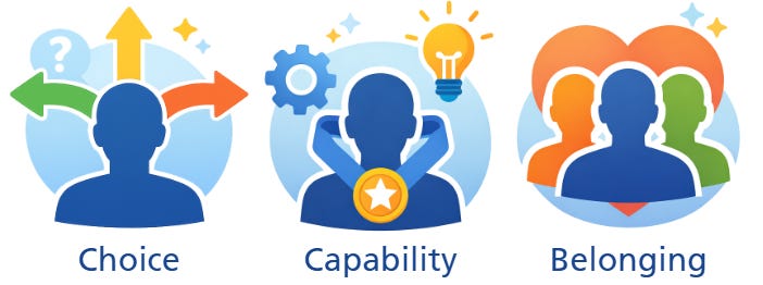 In SDT language, these are autonomy, competence, and relatedness.